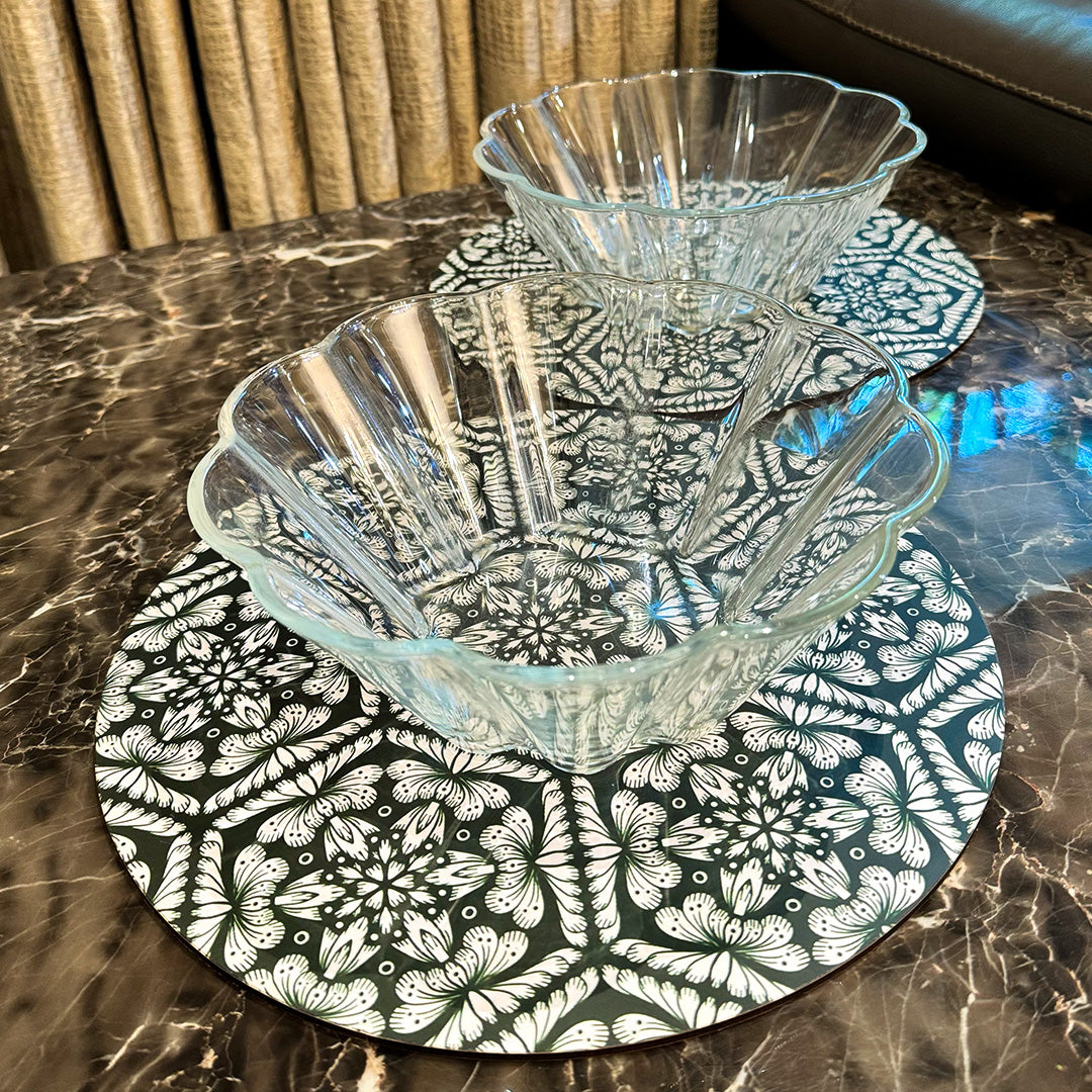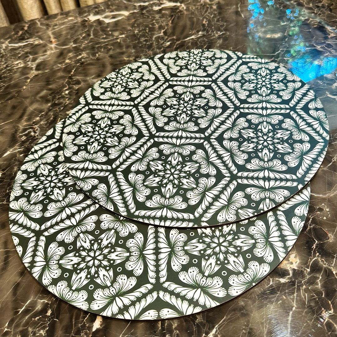 Add earthy tones to your tables with our round placemats adorned with kaleidoscope mandala art. The white floral design on a dark green backdrop offers a striking and sophisticated look, perfectly complementing any setting with its beauty.